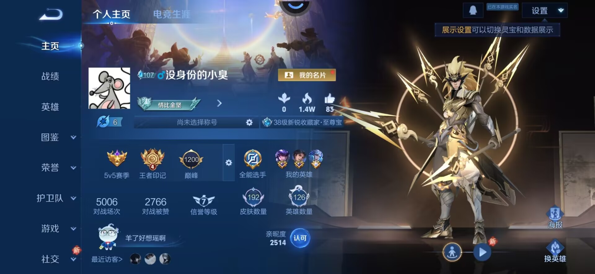 适配系统:安卓 角色名:没身份的小臭 信誉分:80 账号类型(腾讯):QQ 排位赛:不允许 段位:绝世王者 巅峰赛:允许 英雄个数:126 皮肤个数:192 分销起租时长:1 VIP等级:4 是否禁言:0