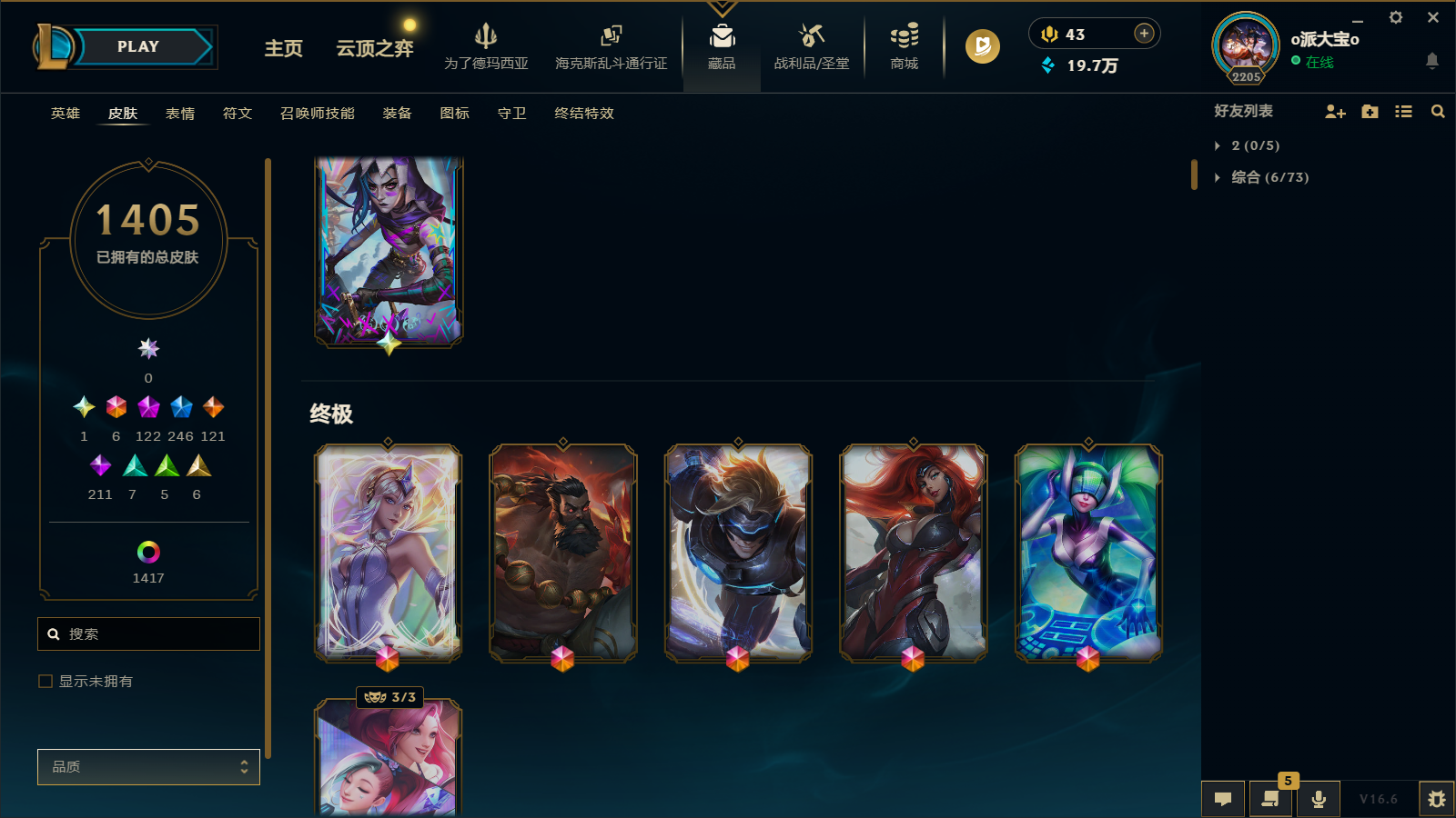 角色等级:2211 角色名:o派大宝o 排位赛:允许 单双排段位:华贵铂金II 灵活组排段位:荣耀黄金I 英雄数量:172 皮肤数量:1408 分销起租时长:1 云顶之弈段位:无段位 双人作战段位:英勇黄铜I