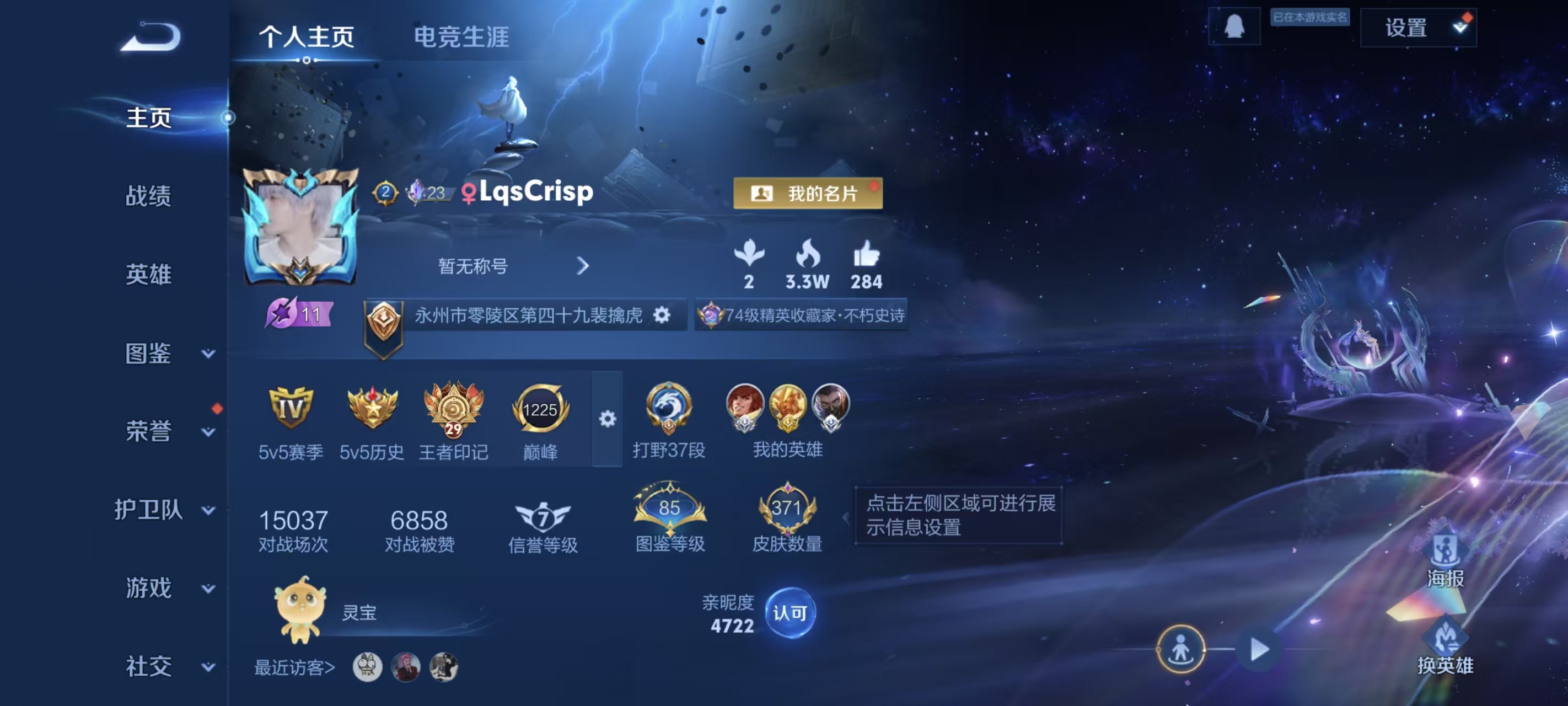 适配系统:安卓 角色名:lqscrisp 信誉分:100 账号类型(腾讯):QQ 排位赛:允许 巅峰赛:允许 段位:至尊星耀 英雄数量:127 皮肤数量:371 是否禁言:否 分销起租时长:1 VIP等级:9