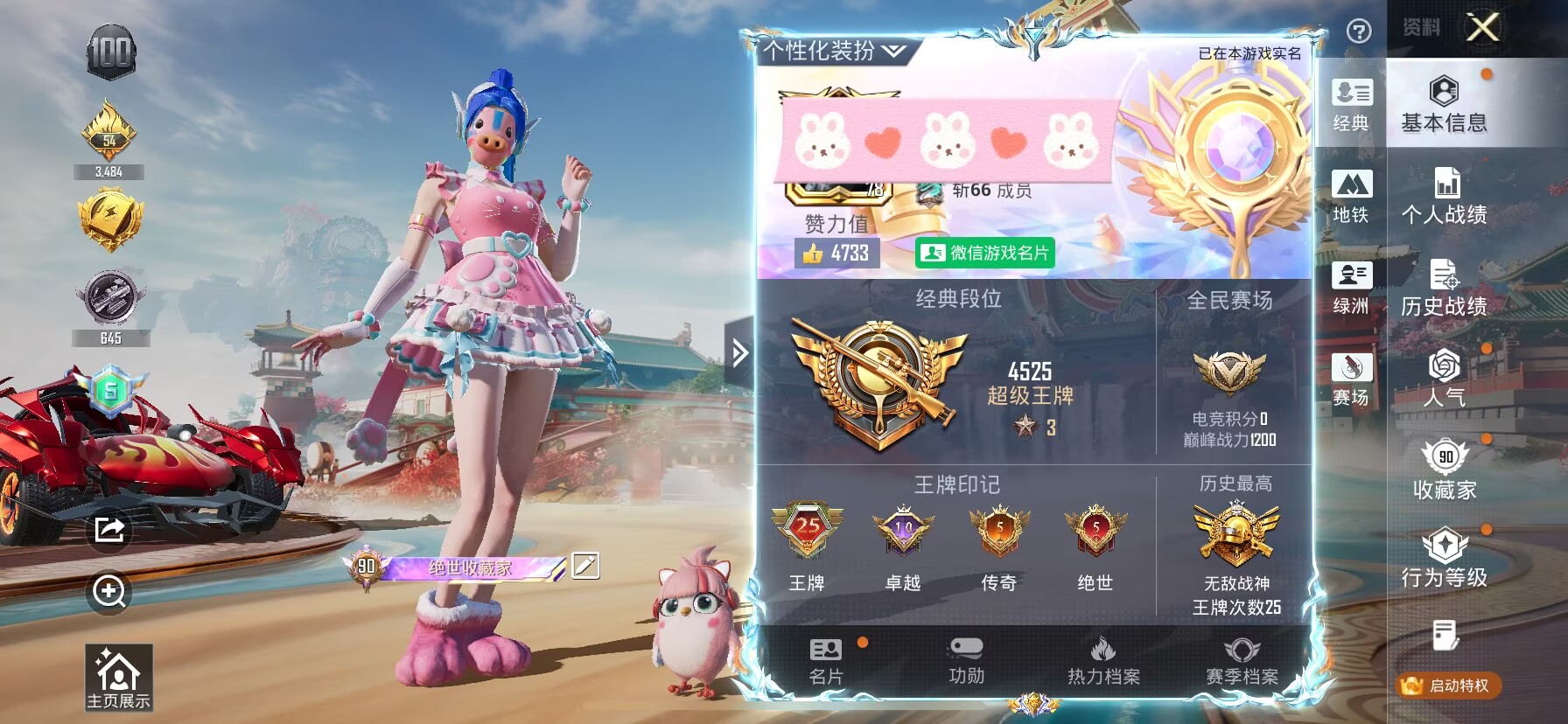 适配系统:苹果 特效枪数量:999 出租次数限制:1 账号类型(腾讯):微信 载具数量:88 分销起租时长:2 套装数量:999 粉色时装数:999 枪皮数量:999
