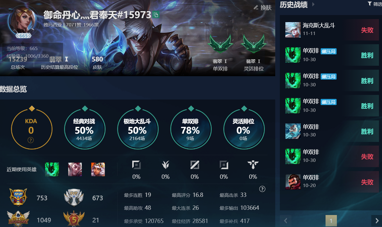 角色等级:673 角色名:御命丹心灬君奉天 排位赛:允许 单双排段位:流光翡翠III 灵活组排段位:- 英雄数量:172 皮肤数量:592 分销起租时长:2 云顶段位:无段位 双人作战段位:无段位