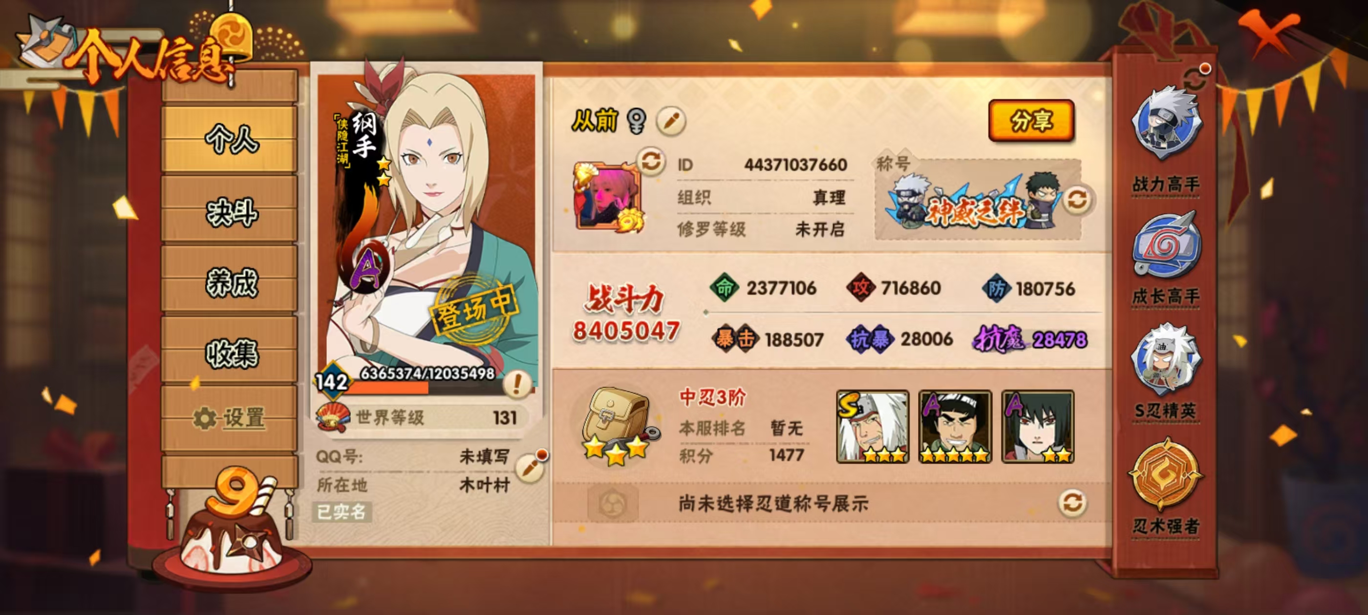 适配系统:安卓 账号类型(腾讯):QQ 战力值:840W A级忍者数:36 S级忍者数:16