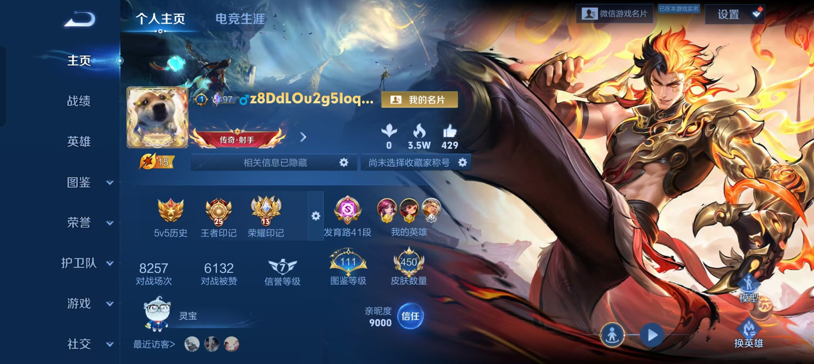 适配系统:安卓 信誉分:100 账号类型(腾讯):微信 排位赛:允许 段位:荣耀王者 巅峰赛:允许 英雄数量:126 皮肤数量:450 分销起租时长:2 VIP等级:9 禁言/不能加好友:0