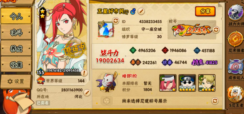 适配系统:安卓 账号类型(腾讯):QQ 分销起租时长:1 战力值:1900 A级忍者数:67 S级忍者数:31