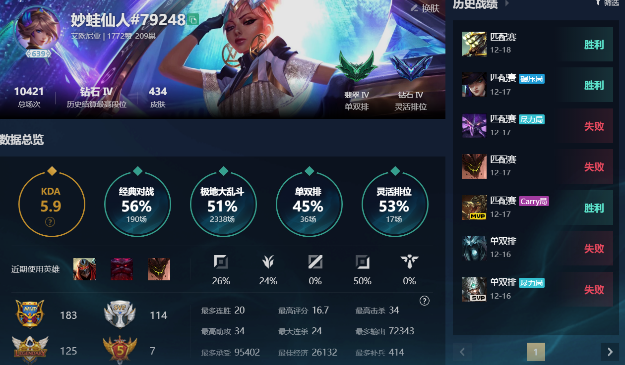 角色等级:640 角色名:妙蛙仙人 排位赛:允许 单双排段位:流光翡翠IV 灵活组排段位:璀璨钻石IV 英雄数量:171 皮肤数量:434 分销起租时长:1 云顶段位:无段位 双人作战段位:坚韧黑铁I