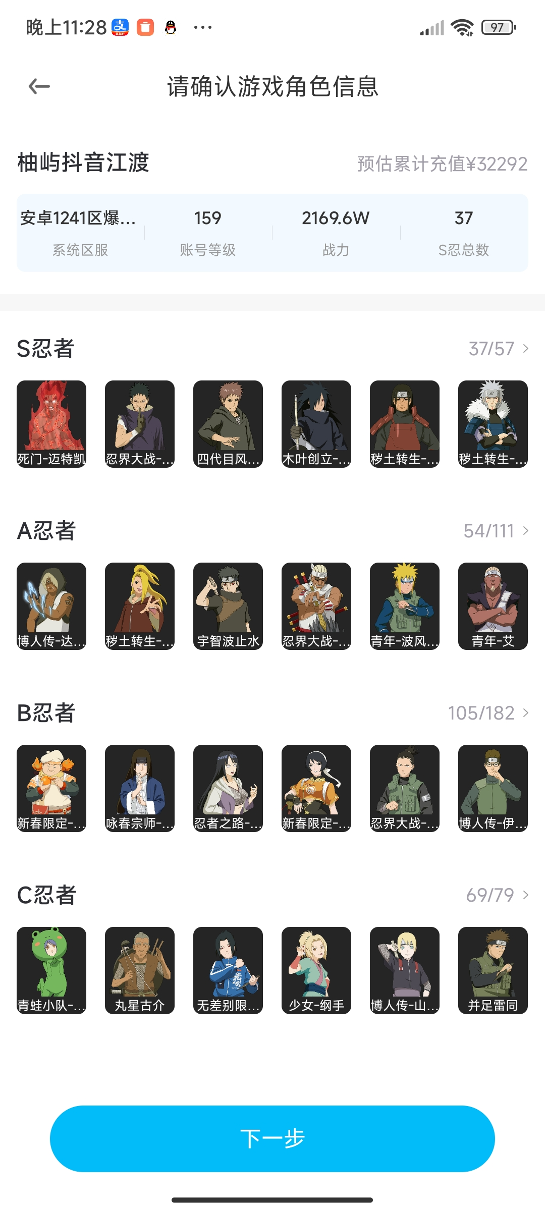 适配系统:安卓 账号类型(腾讯):QQ 分销起租时长:1 战力值:2169W A级忍者数:54 S级忍者数:37