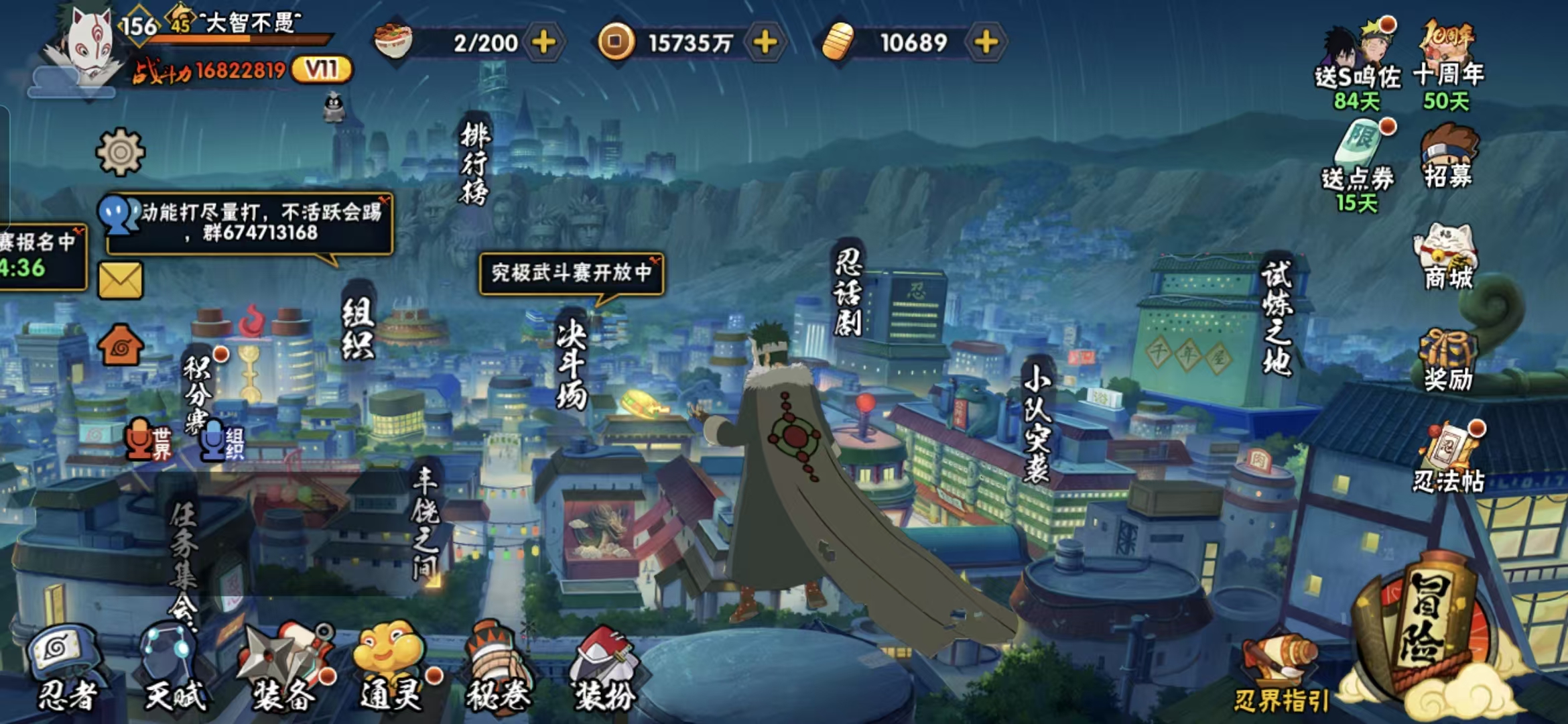 适配系统:安卓 账号类型(腾讯):QQ 分销起租时长:1 战力值:1600W A级忍者数:49 S级忍者数:26