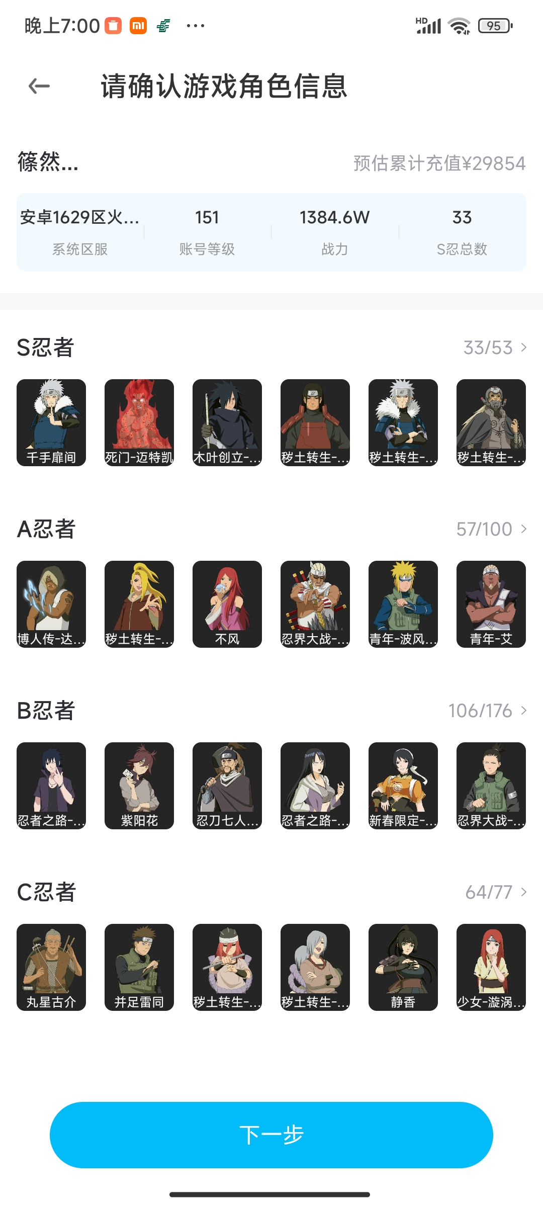 适配系统:安卓 账号类型(腾讯):QQ 分销起租时长:1 战力值:1400W A级忍者数:57 S级忍者数:29