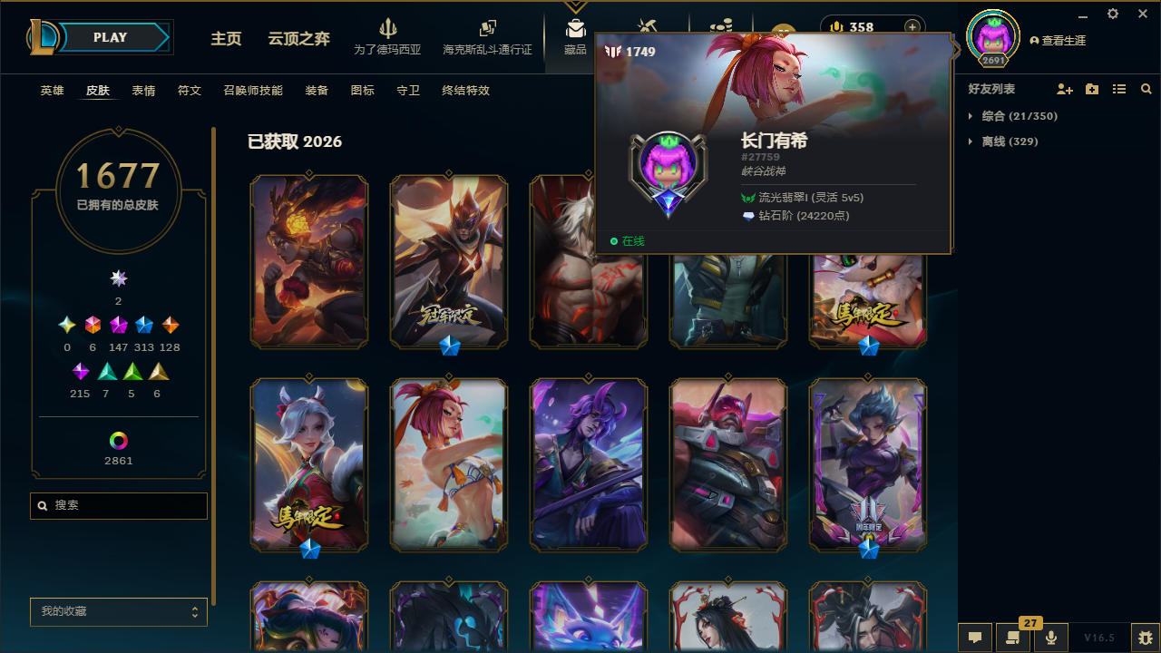 角色等级:2709 角色名:长门有希 排位赛:不允许 单双排段位:华贵铂金III 灵活组排段位:流光翡翠I 英雄数量:172 皮肤数量:1689 双人作战段位:无段位 分销起租时长:1