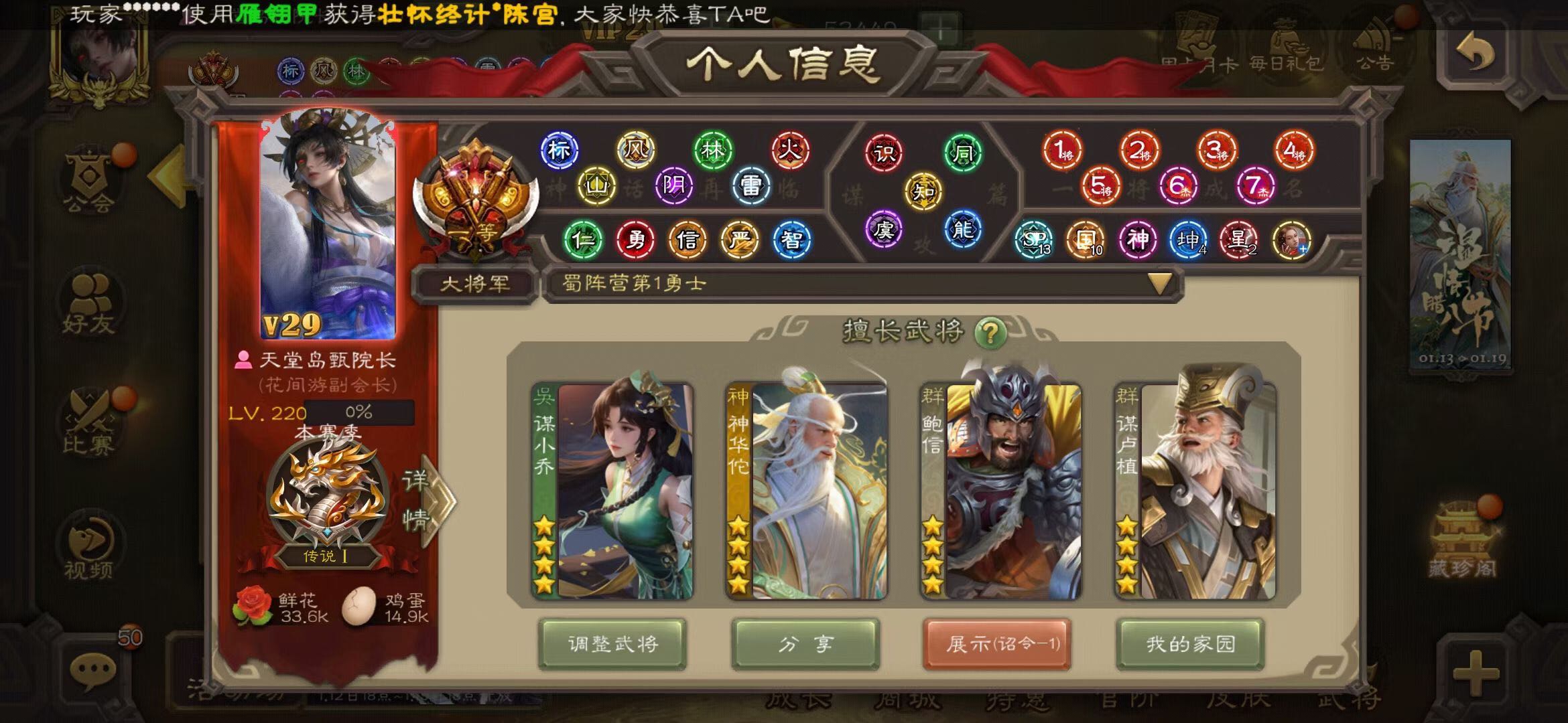 史诗武将数:999 官阶:大将军 神武将数量:999 动态皮肤数:999 是否有卡:是