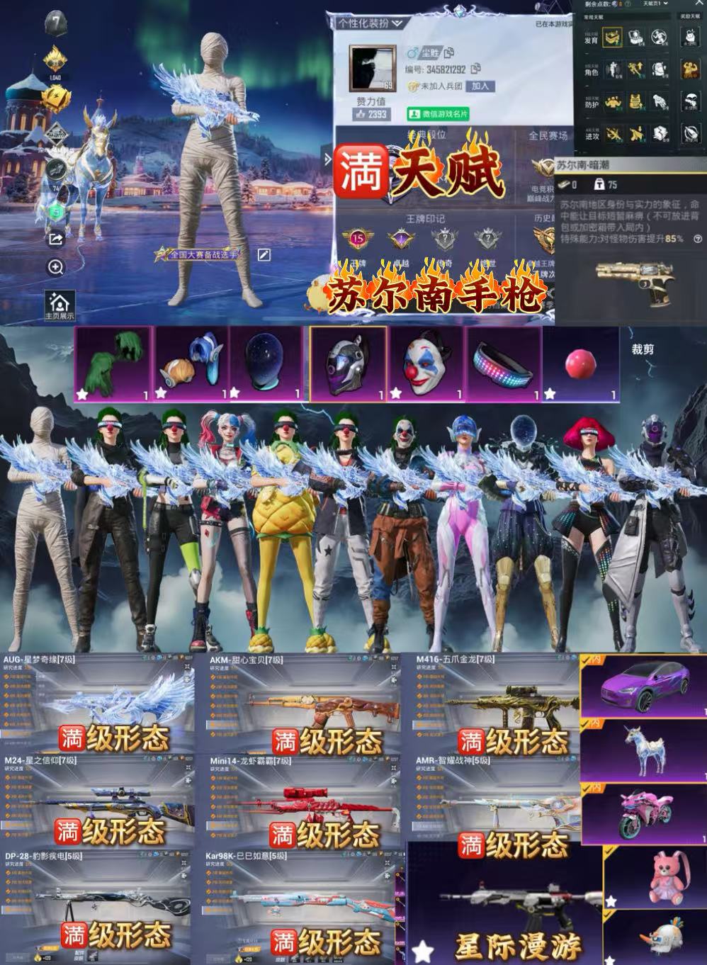 适配系统:苹果 账号类型(腾讯):微信 分销起租时长:1 载具皮肤:3 粉色时装数:29 套装数量:231 特效枪数量:25 枪皮数量:245