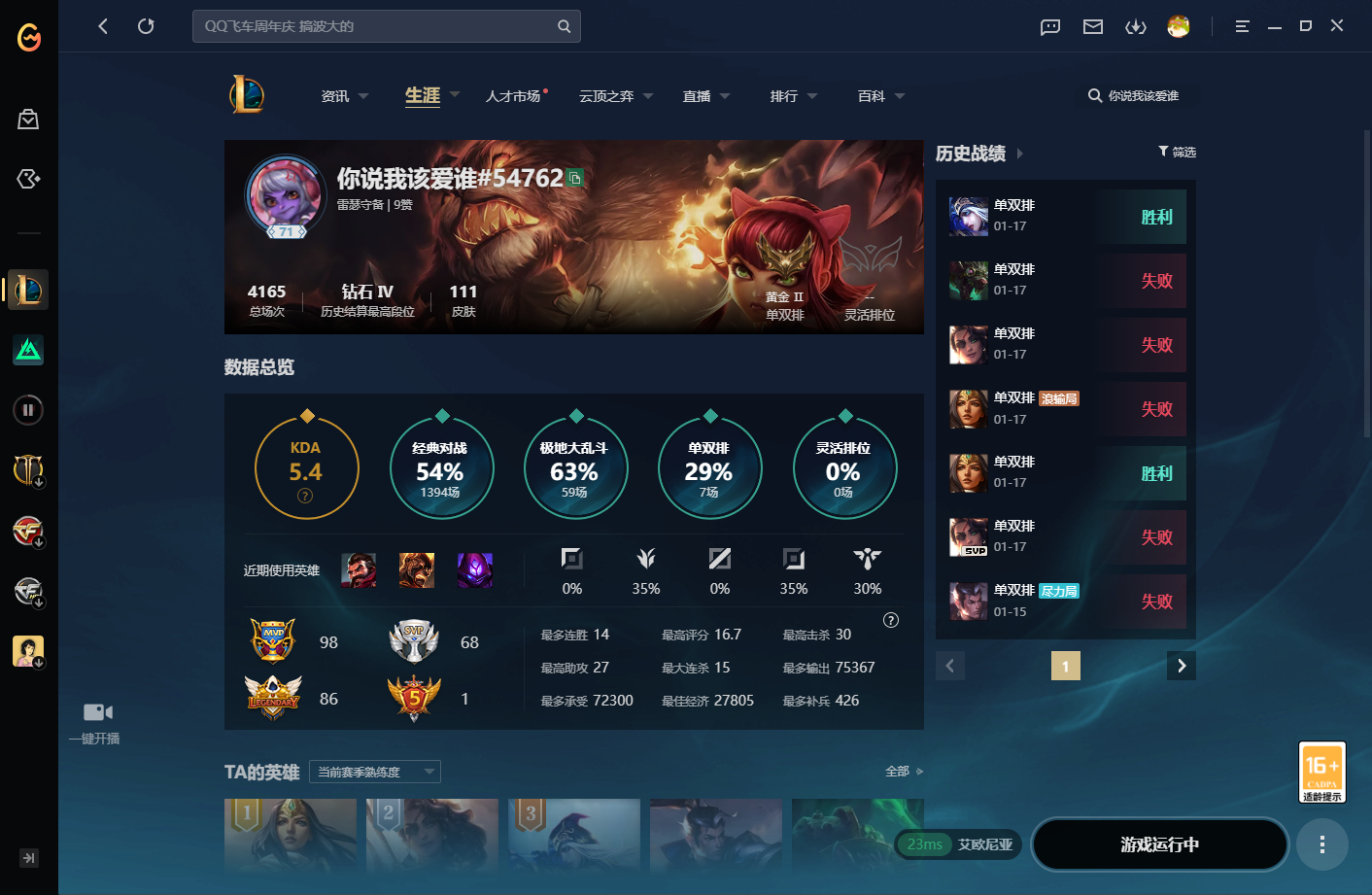角色等级:77 角色名:你说我该爱谁 排位赛:不允许 单双排段位:荣耀黄金II 灵活组排段位:不屈白银I 英雄数量:159 皮肤数量:113 双人作战段位:无段位 分销起租时长:1