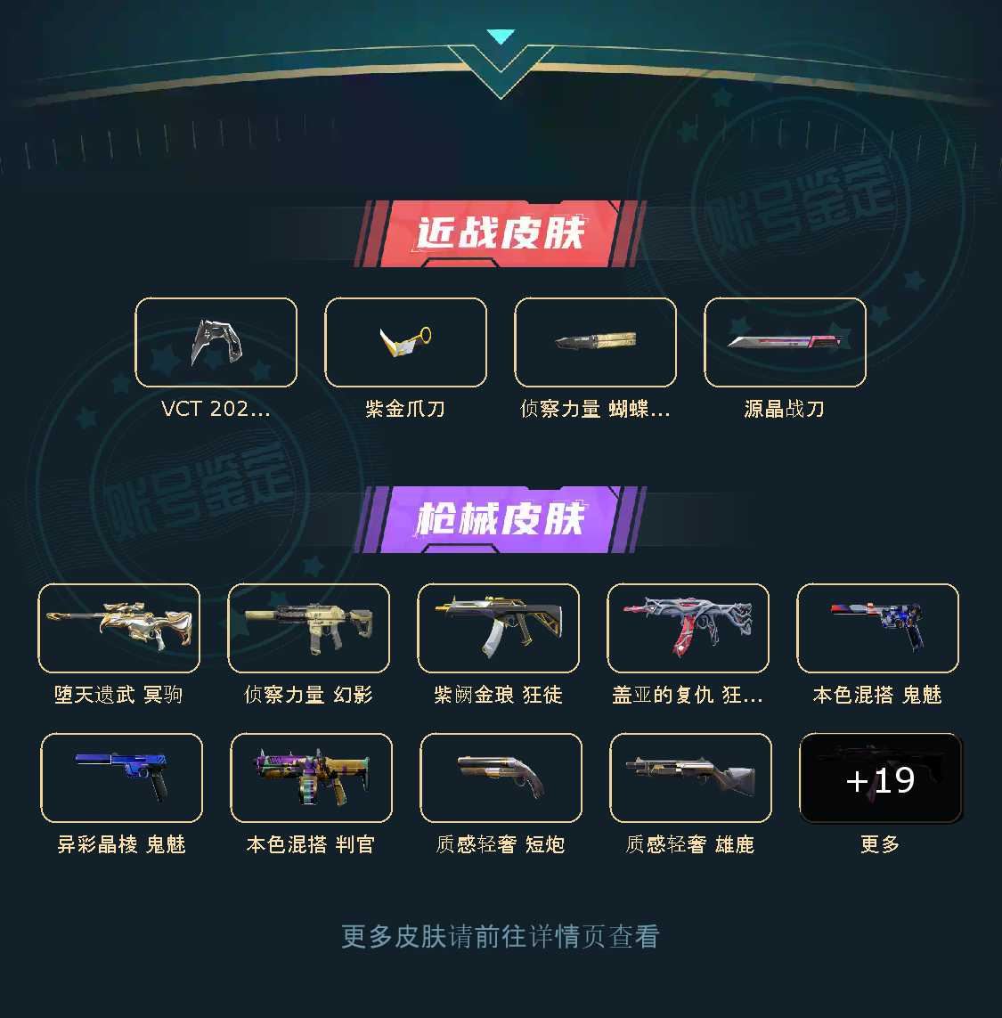 观察期22级收藏家 VCT 爪刀 侦察力量 幻影 紫阙金琅 狂徒 盖亚的复仇 狂徒 堕天遗武 冥驹 侦察力量 蝴蝶...