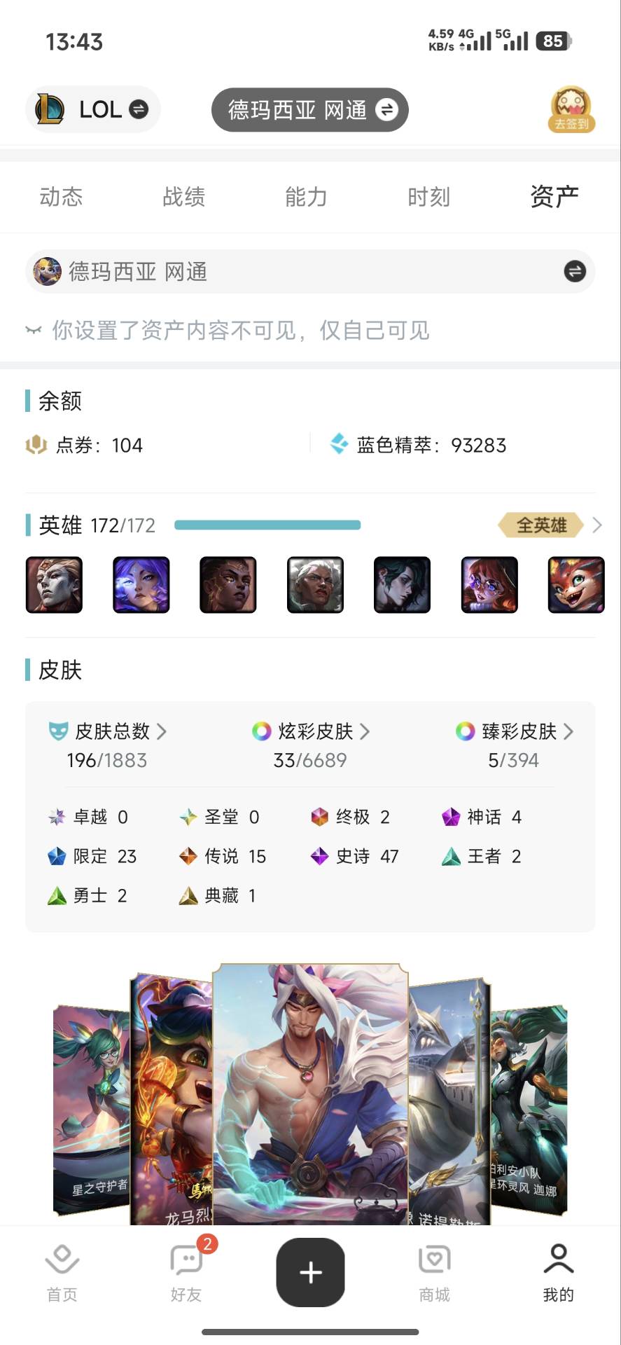 角色等级:295 角色名:你说灬当我不再 排位赛:允许 单双排段位:华贵铂金I 灵活组排段位:荣耀黄金I 英雄数量:172 皮肤数量:201 分销起租时长:1 云顶段位:无段位 双人作战段位:无段位