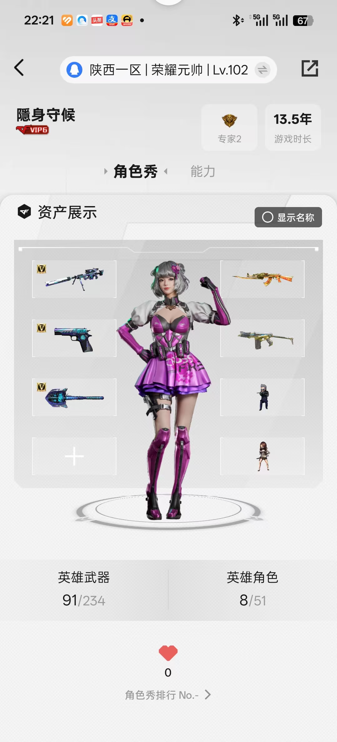 英雄武器数:73 王者武器数:2 枪王排位等级:荣耀枪王 账号类型:爆破号 到时不下线:0 分销起租时长:2 段位积分:4132 排位赛:允许 VIP等级:无