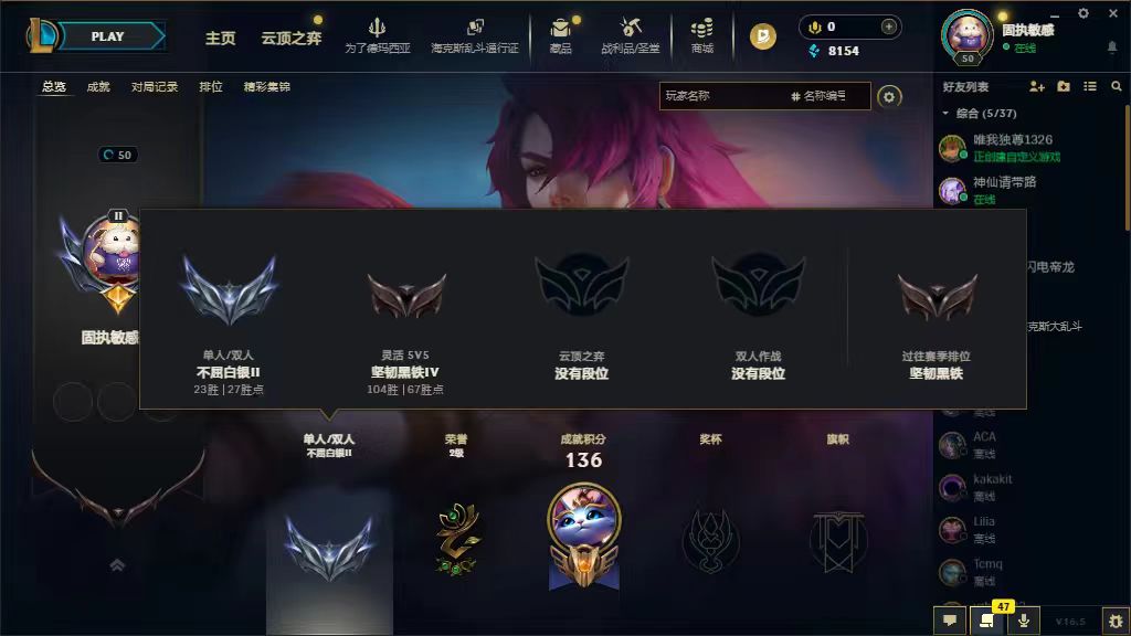 角色等级:39 角色名:彷佛过 排位赛:允许 单双排段位:不屈白银II 灵活组排段位:坚韧黑铁III 英雄数量:105 皮肤数量:0 双人作战段位:无段位 分销起租时长:3