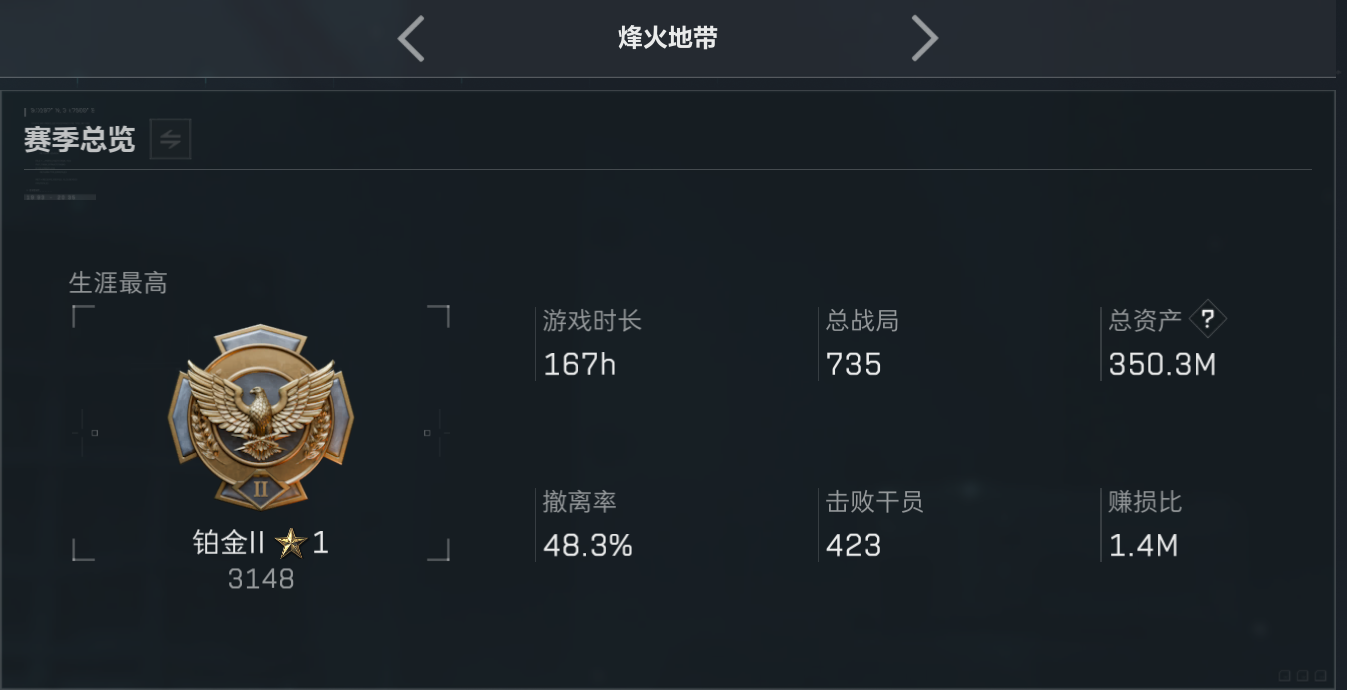 哈夫币比例:17 烽火地带等级:60 全面战场段位:列兵 负重等级:满级 典藏皮肤数:6 哈夫币:253723240 载具皮肤数:12 AWM红弹数量:85 角色名:我会出大红h 六套装备数量:39 烽火地带段位:铂金 干员数:12 体力等级:满级 普通皮肤数:105