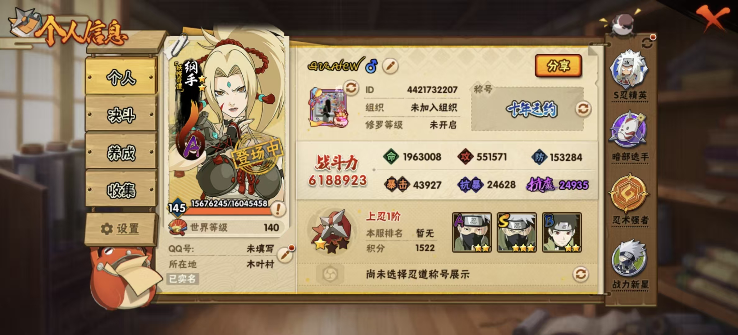 适配系统:安卓 账号类型(腾讯):QQ 战力值:630W A忍者数量:34 S级忍者数:12