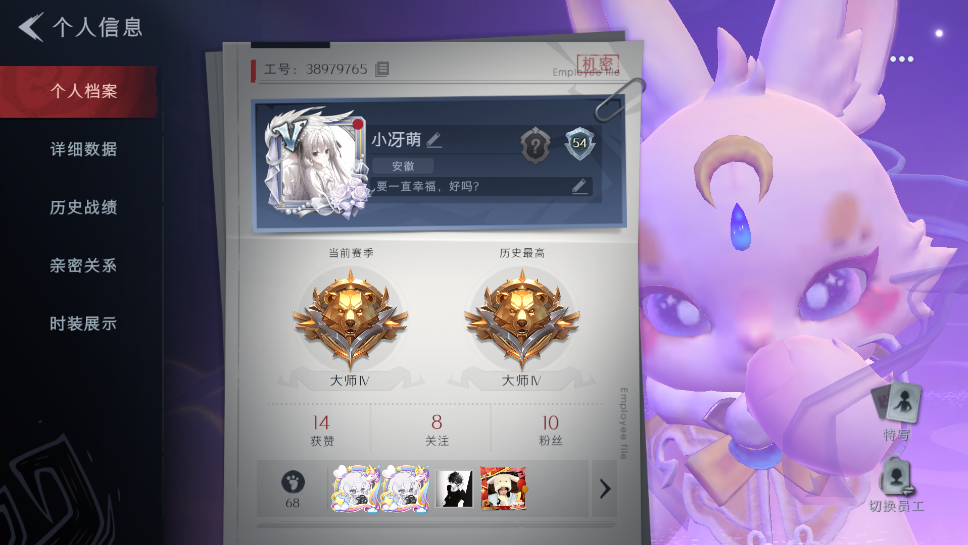 金色皮肤:2 紫色皮肤:0 是否有兔宝:是 道具皮肤:2