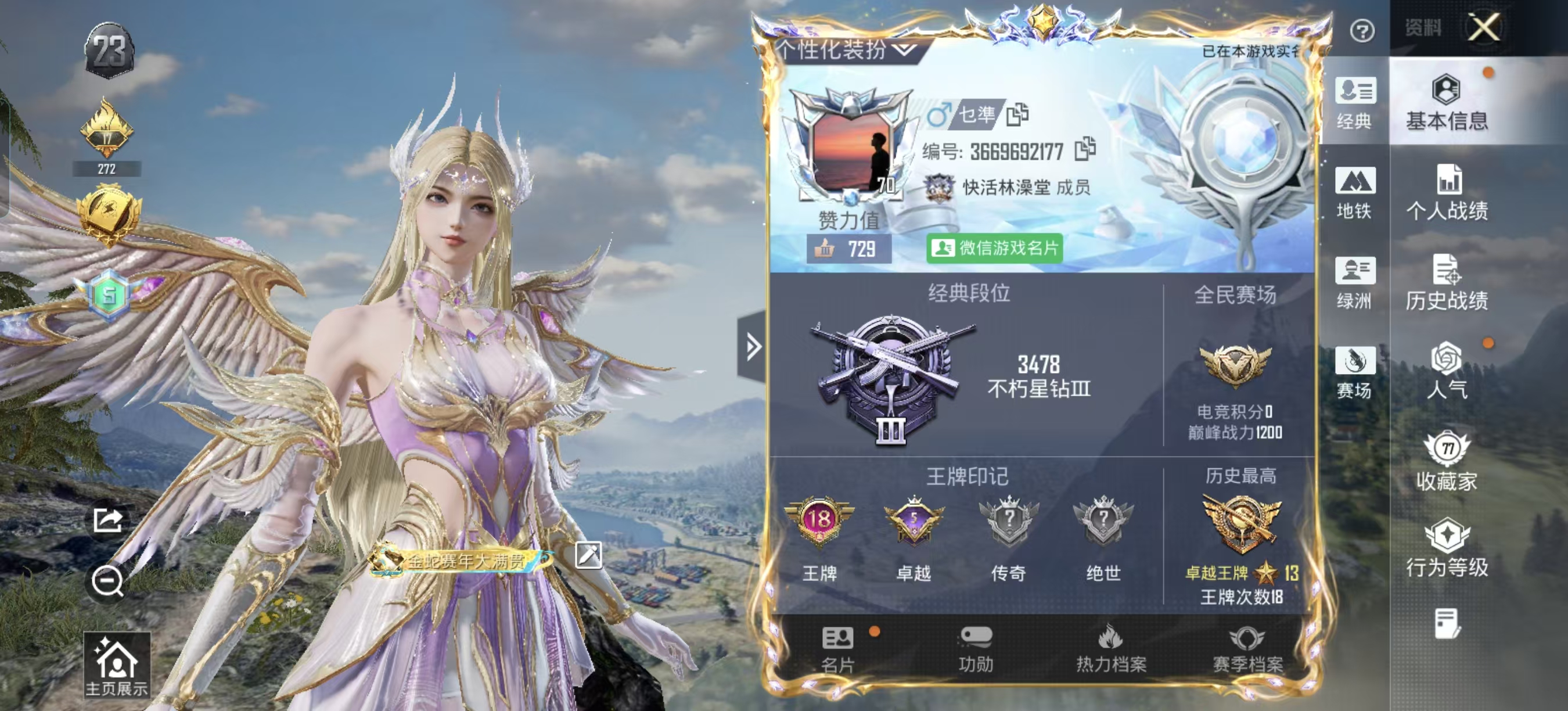 适配系统:安卓 红装数量:0 账号类型(腾讯):微信 分销起租时长:1 载具皮肤:6 粉色时装数:14 套装数量:217 特效枪数量:14 枪皮数量:274