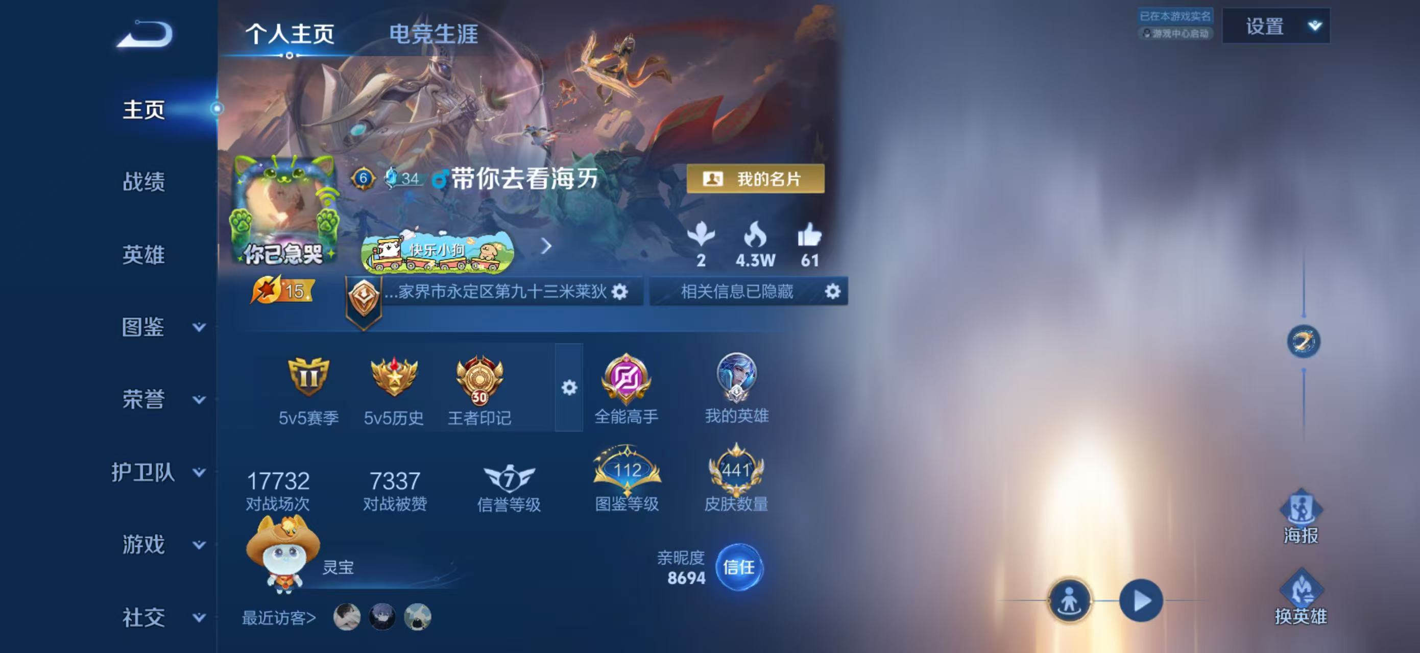 适配系统:苹果 角色名:带你去看海ㄞ 信誉分:100 账号类型(腾讯):QQ 排位赛:允许 段位:至尊星耀 巅峰赛:允许 英雄数量:129 皮肤数量:441 分销起租时长:1 VIP等级:9 禁言/不能加好友:否