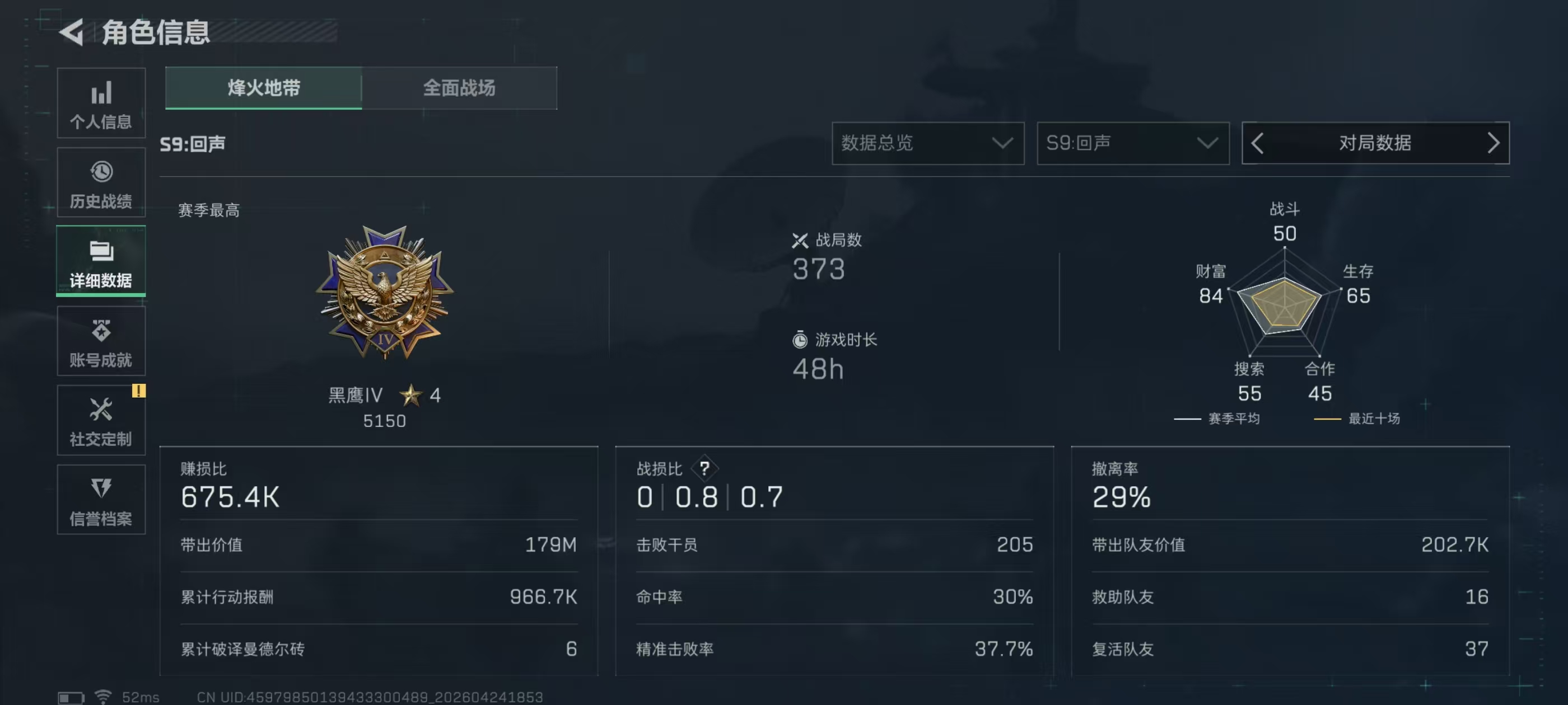 哈夫币比例:13 烽火地带等级:60 全面战场段位:上等兵 负重等级:满级 典藏皮肤数:10 哈夫币:114046426 AWM红弹数量:10 载具皮肤数:20 六套装备数量:0 角色名:Nuuuuuiii 烽火地带段位:黑鹰 干员数:12 体力等级:满级 普通皮肤数:213